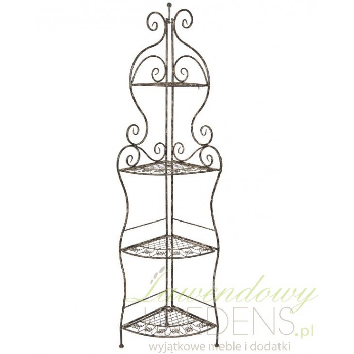 Meble w stylu prowansalskim to bogactwo zdobień i finezyjnych linii. Meble metalowe to bardzo modny sposób na ozdobę mieszkania. Narożny metalowy regał ma brązowy kolor i cztery półeczki, na których znajdą się urocze i kolorowe kwiatuszki. Warto go mieć w swoim domu!
