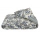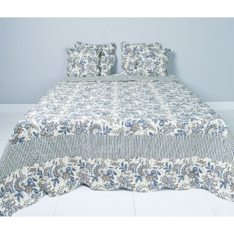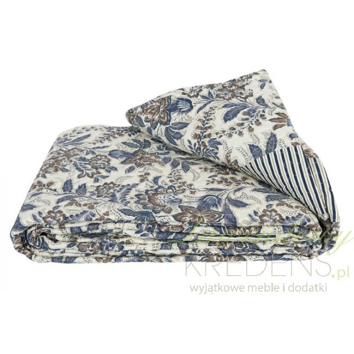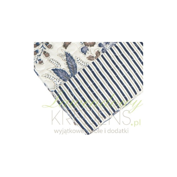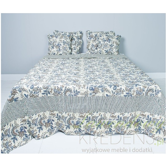 Wzorzysta narzuta na łóżko w odcieniach bieli i ciemnego błękitu z wyraźnie odcinającym się fragmentem materiału w pasy. Idealna do stonowanych wnętrz, ze względu na dużą intensywność zdobień i skomplikowanych elementów. Dzięki dużym rozmiarom nasza narzuta patchworkowa poradzi sobie nawet z okryciem niemałych powierzchni.