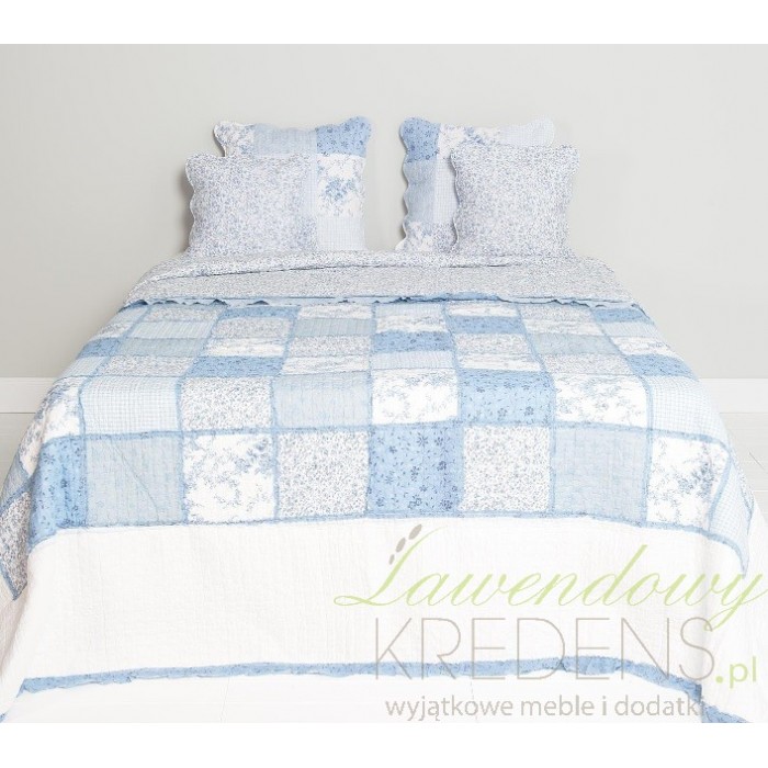 Duża, kwadratowa narzuta w przepięknych niebieskich kolorach, które wpołączeniu z neutralną bielą wyglądają oszałamiająco w każdym wnętrzu. Dodatkowa obecność kwiecistych motywów na kazdym elemencie narzuty na łóżko sprawia, że nie będziesz chciałą zamienić jej nażadną inną!