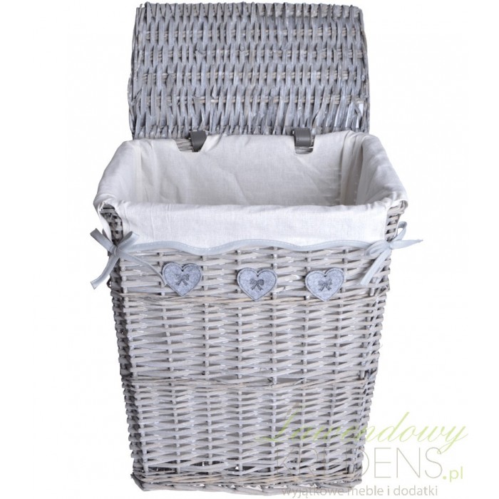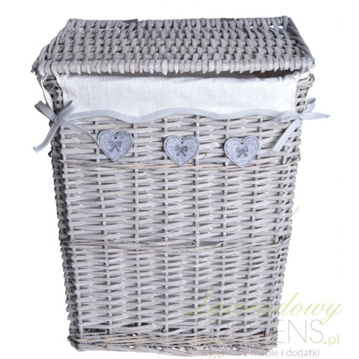 Śliczny, szary wiklinowy kosz na bieliznę pochodzenia holenderskiego z przodu z motywem w serduszka!