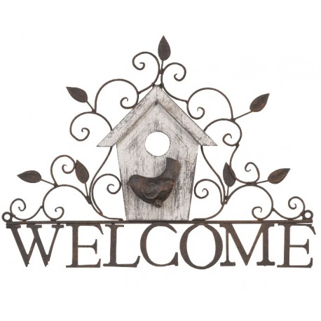 Metalowy szyl welcome z ozdobnym domkiem i ptaszkiem, to prowansalska dekoracja dla każdego.