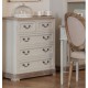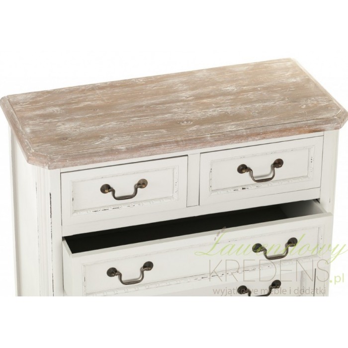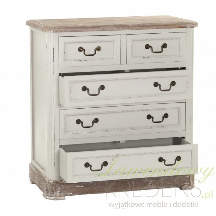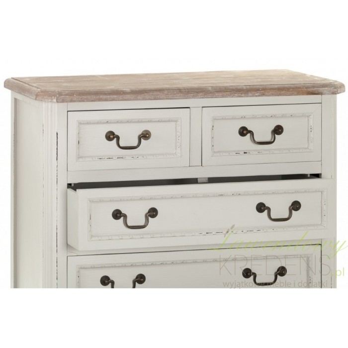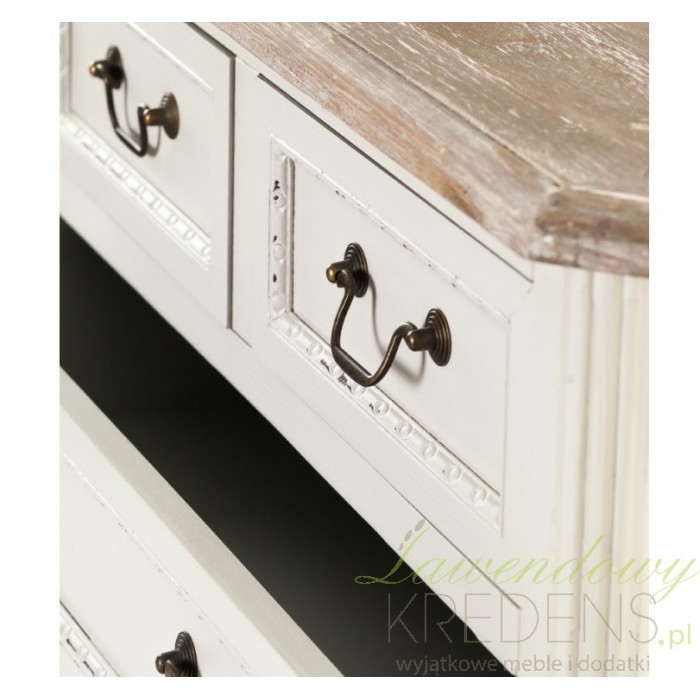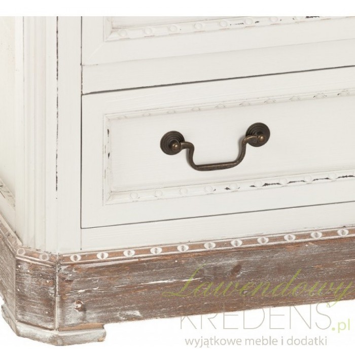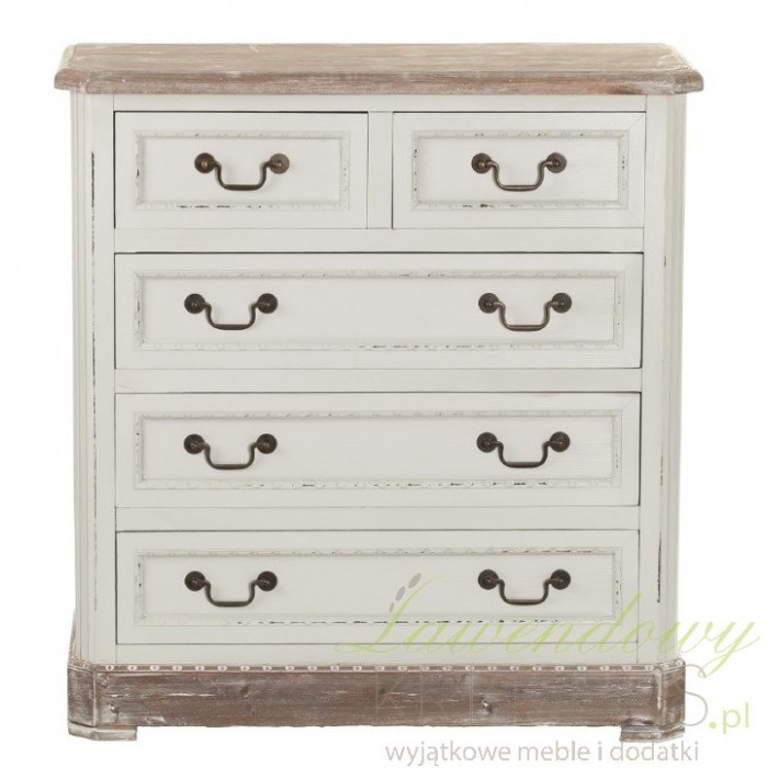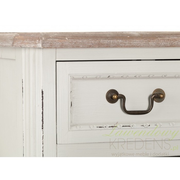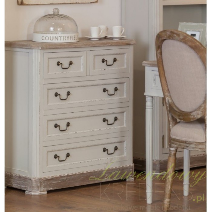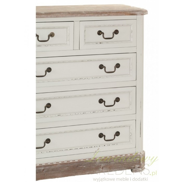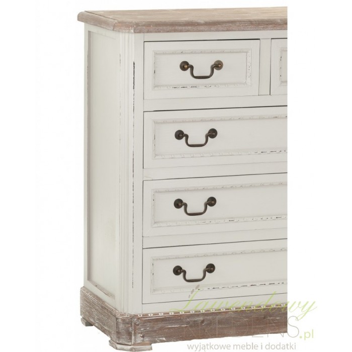 Komoda prowansalska firmy Aluro wykonana jest z wysokiej jakości drewna i płyty MDF w kolorze jasnoszarym z przetartą farbą. Komoda Palida posiada trzy duże szuflady i dwie małe na bieliznę i różne drobiazgi. Doskonale pasuje do pokoju czy sypialni. Meble prowansalskie to nowoczesne i modne rozwiązania dla twojego mieszkania.
