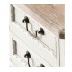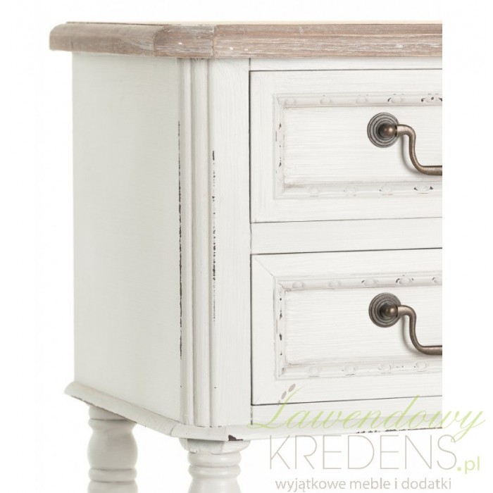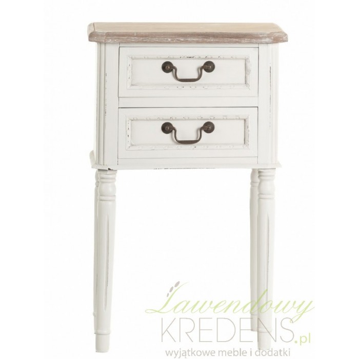Jasnoszary stolik nocny prowansalski firmy Aluro z dwoma szufladkami i brązowym blatem!