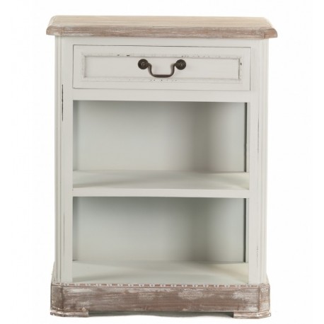 Meble prowansalskie to wspaniałe, ozdobne meble, które przyprawią twoich gości o zawrót głowy. Szafka Palida wykonana została w kolorze jasnoszarym z drewna i płyty MDF. Szafka prowansalska może pełnić funkcję szafki nocnej i stać obok łóżka w sypialni. Posiada dwie otwarte półeczki i jedną delikatnie zdobioną szufladkę.