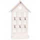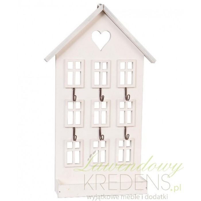 Biały wieszak na klucze w kształcie domku oprócz haczyków ma również małą półeczkę na dodatkowe drobiazgi.
