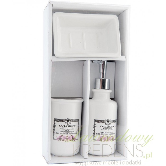 Zestaw łazienkowy prowansalskich pojemników w twojej łazience? Dzięki tym ślicznym pojemnikom w białym kolorze wreszcie poczujesz, że łazienkowemu wnętrzu nic nie potrzeba. Zestaw w stylu prowansalskim składa się z prostokątnej mydelniczki, białego pojemnika na mydło w płynie i kubeczka. Te dodatki do łazienki i styl prowansalski sprawiają, że poranne czynności w łazience są o wiele przyjemniejsze.