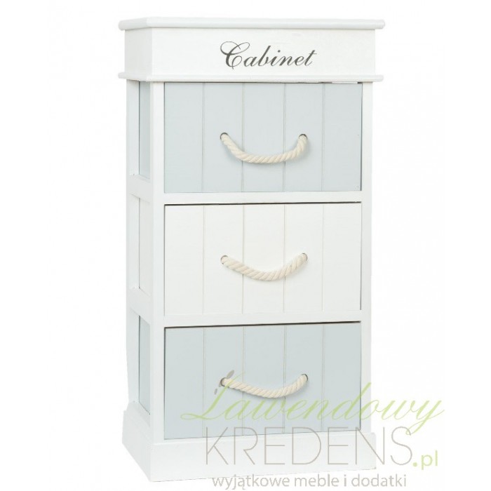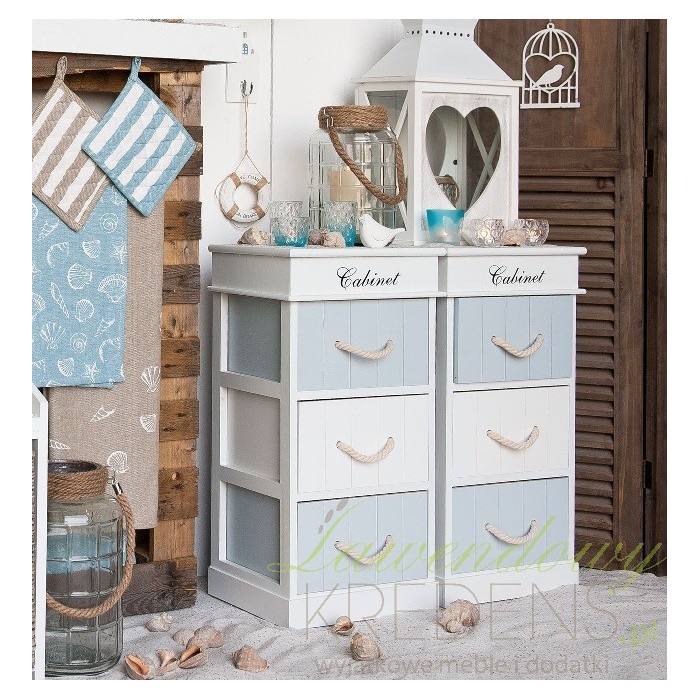 Utrzymana w jasnych, marynistycznych kolorach bieli i błękitu komoda prowansalska, której szuflady otwierane są po pociągnięciu za rewelacyjne uchwyty wykonane z grubysz sznurków. Komoda marynistyczna przepięknie wygląda w połączeniu ze stylowymi dodatkami w prowansalskim klimacie, któa także znajdziesz w naszym sklepie!