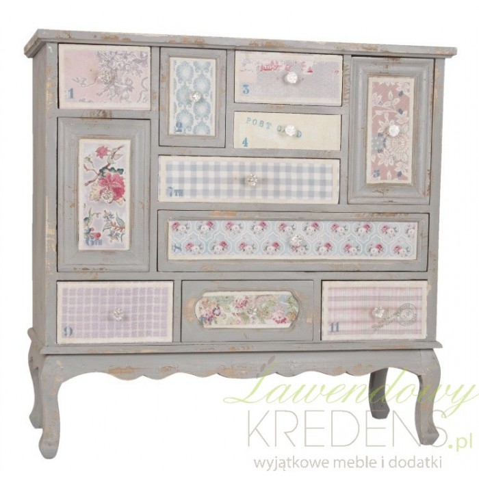 Wspaniała, duża komoda Shabby Chic wykonana jest z drewna w kolorze szarym z licznymi przetarciami. Posiada osiem szuflad w różnych rozmiarach i trzy szafeczki. Wszystkie są ponumerowane i każda ma inny, ciekawy motyw na przodzie. Meble Shabby Chic to genialna i nietuzinkowa ozdoba mieszkania. Polecamy!
