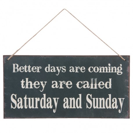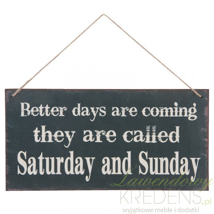 Obrazki retro to świetna i niebanalna dekoracja wnętrza. Metalowe obrazki mogą wisieć na lodówce lub w dowolnym miejscu, ślicznie zdobiąc pokój. Drewniany obrazek firmy Clayre & Eef ma czarny kolor a na jego tle białe, przetarte przezabawne napisy w języku angielskim. Na tej tabliczce napis brzmi Lepsze dni przyjdą nazywają się Sobota i Niedziela.