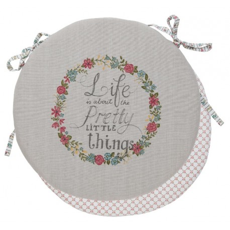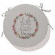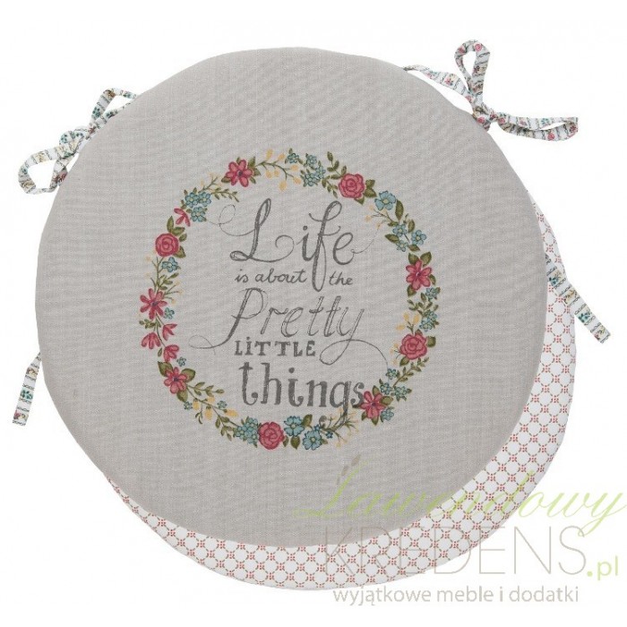 Poduszki na krzesła dodają wnętrzu wdzięku i przytulności. Okrągłe poduszki na krzesła wykonane są z oddychającej bawełny w kolorze beżowym. Okrągła poduszka firmy Clayre & Eef ma na środku kolorowy wieniec z kwiatów a w środku angielski napis. Z drugiej strony poduszki znajduje się charakterystyczny wzór.