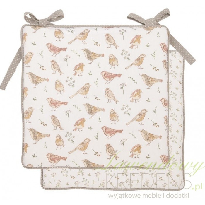 Kwadratowa poduszka na krzesło na której zauważyć można jasne tło, a na nim ptaszki. Poduszki ozdobne od Clayre & Eef to dodatki do jadalni, dzięki czemu siedzenie przy stole podczas posiłku i nie tylko stanie się niezwykle wygodne. Zachęcamy do zobaczenia wszystkie nasze poduszki na krzesła.