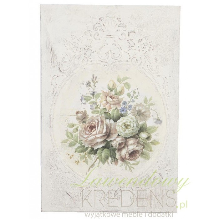 Duży obraz firmy Clayre & Eef wykonany jest z drewna w kolorze beżowym. Obraz prowansalski ma ciekawy wzór, przypominający starodawną ramę lustra, a w niej znajduje się bukiet przepięknych kwiatów. Obraz posiada liczne przetarcia. Duże obrazy w charakterystyczny sposób zmieniają wystrój wnętrza.