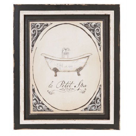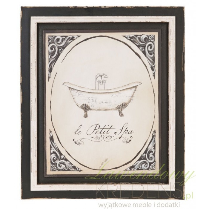 Dodatki do łazienki, a wśród nich obrazy do łazienki to przepiękna dekoracja mieszkania, która doda wyjątkowego klimatu i nastroju. Obraz do łazienki ma kolor czarno-biały i wykonany jest z drewna. Rama obrazu jest postarzana, a środek obrazu zdobi rysunek wanny i francuski napis le Petit Spa.