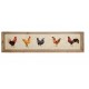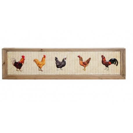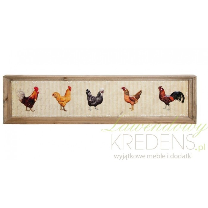 Niski, ale długi obraz w stylu rustykalnym, na którym dumnie prezentuje się pięć kolorowych kogutów wykonanych z metalu!