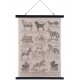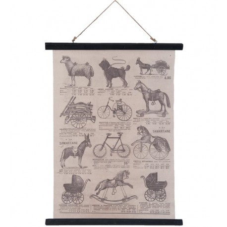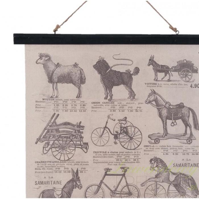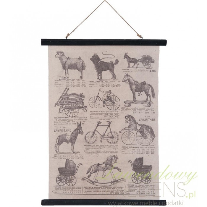 Obraz Vintage ma czarno-biały kolor i wygląda niczym mapa. Przedstawia różne zwierzęta i produkty jak na przykład wózki i ma opisy z nimi związane w języku francuskim. Obrazy w stylu Vintage to lniane obrazy w drewnianej, czarnej ramie.