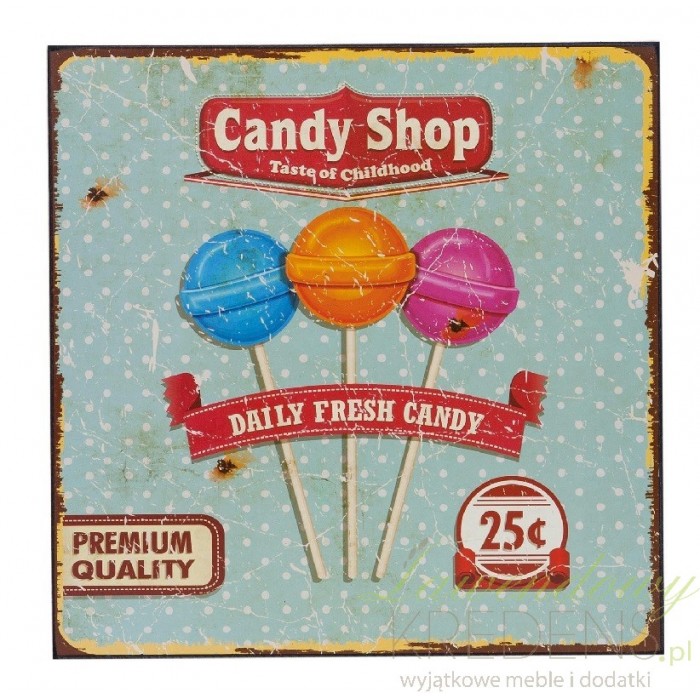 Kwadratowy obrazek retro posiadający niebieskie tło w białe kropeczki, a na nim grafika na której widoczne są napisy oraz trzy różno kolorowe lizaki. Obrazki retro ze słodkościami to coś co każdy z nas bardzo lubi. Postarzane obrazki w stylu retro mają swój indywidualny klimat.