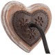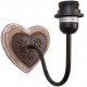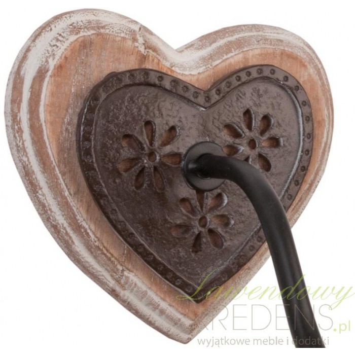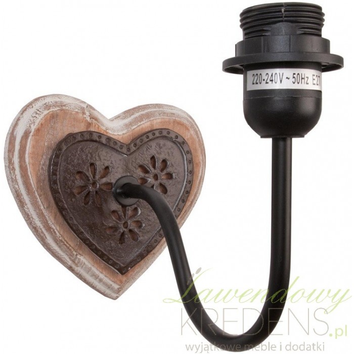 Kinkiet w stylu rustykalnym, którego część montowana do ściany jest wykonana z drewna i metalu i ma kształt serca. Do drewnianego serca o bielonej powierzchni przymocowane jest metalowe serce o ażurowym wzorze z trzema kwiatkami.