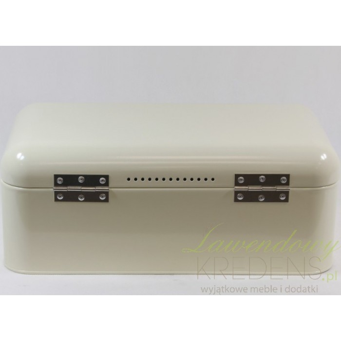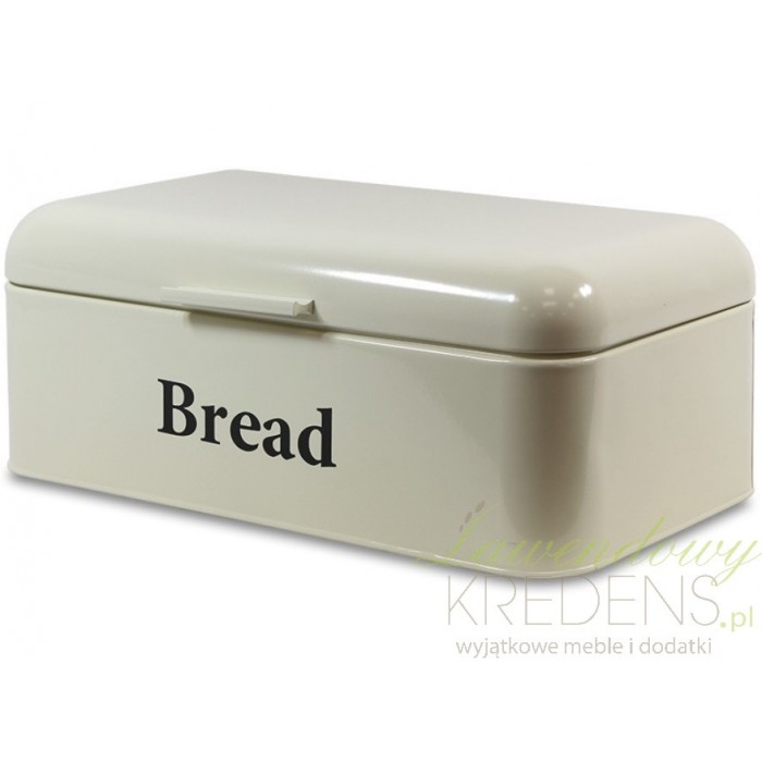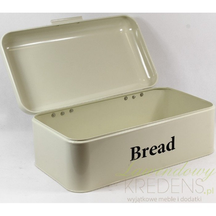 Kremowy chlebak w prostopadłościennej formie z zaokrąglonymi rogami i z wygodnym zamknięcie w postaci klapy na zawiasach. Takie rozwiązanie pozwoli zachować Twoje pieczywo w świeżości na dłużej. Dodatkowo chlebak metalowy na frontowej powierzchni posiada czarny napis BREAD dzięki czemu jest bardziej widoczny!