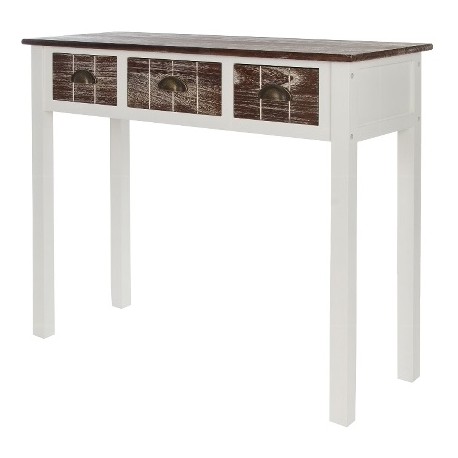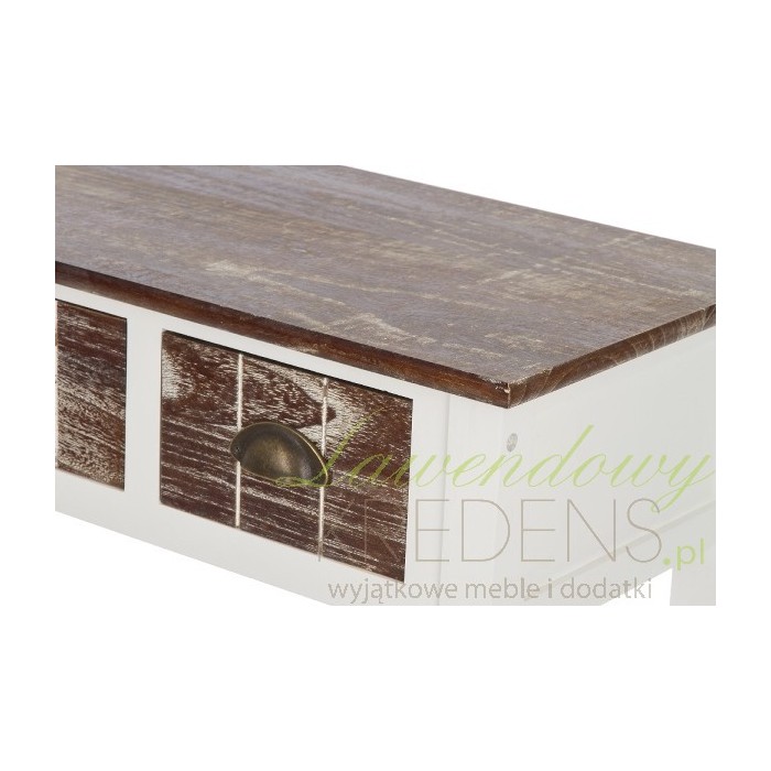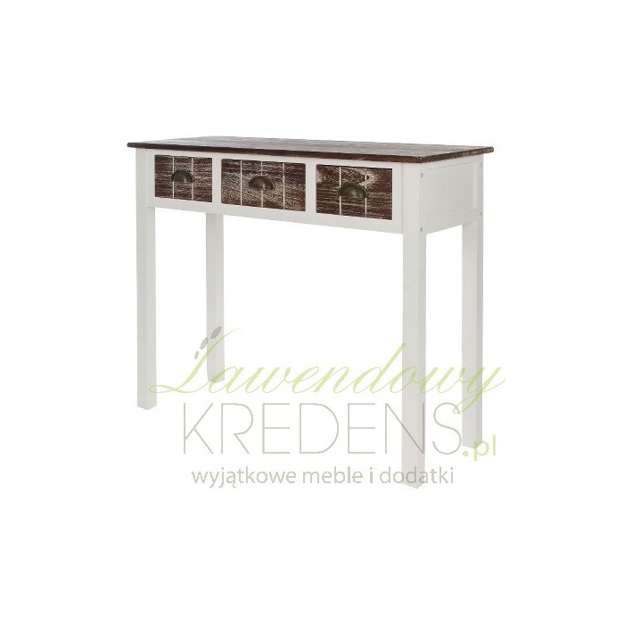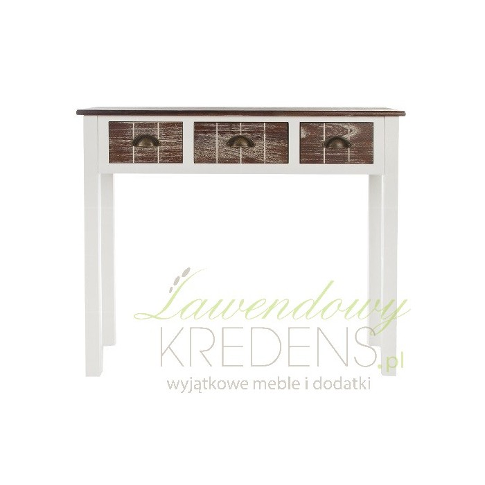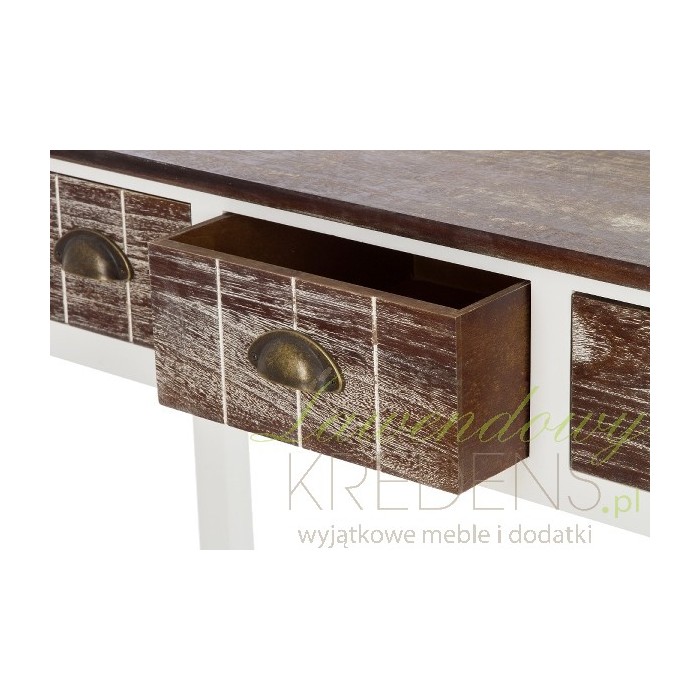 Meble w stylu prowansalskim to jakość wykonania i zniewalający wygląd. Konsola prowansalska pochodzenia niemieckiego wykonana jest z drewna w kolorze białym, a blat i fronty szuflad są w kolorze bielonego, ciemnego brązu. Konsola w stylu prowansalskim to interesujący i elegancki mebel, który doskonale posłuży jako biuro czy stolik w dużym pokoju.