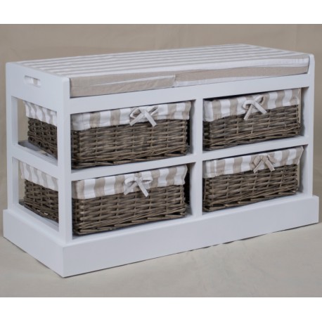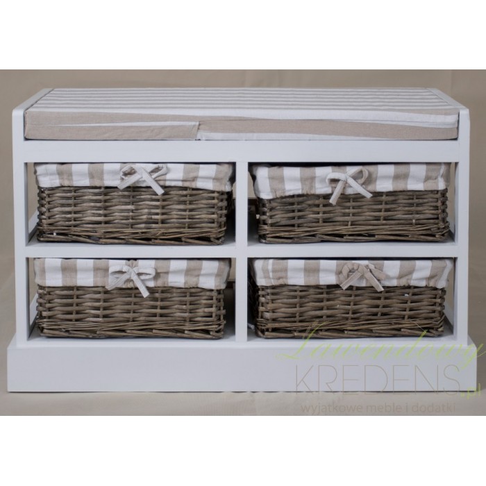 Meble w stylu prowansalskim to bardzo modne rozwiązanie w stylizacji wnętrz. Szafka z siedziskiem ma biały kolor i wykonana jest z wysokiej jakości drewna. Posiada cztery wysuwane wiklinowe kosze, które mogą posłużyć na klucze czy inne drobiazgi. Szafka z koszami stanowi ponadto wspaniałą dekorację mieszkania.