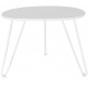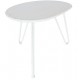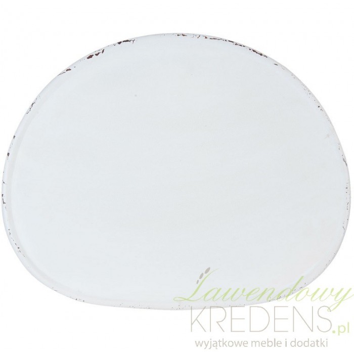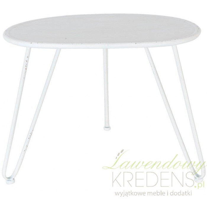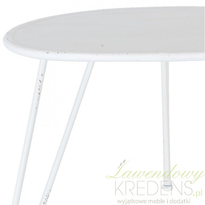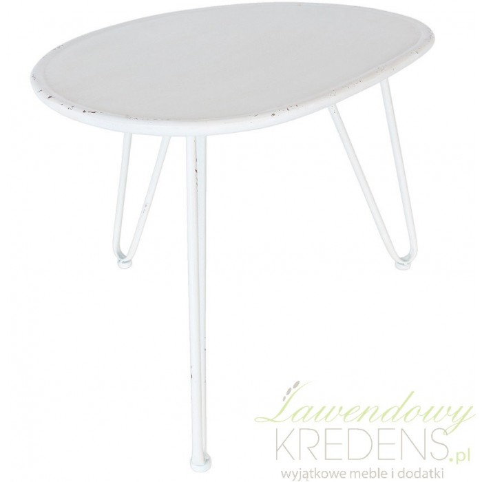 Meble metalowe to nowy design twojego mieszkania. Stolik kawowy ma bliżej nieokreślony kształt i stoi na trzech nogach. Metalowy stolik ma biały kolor z celowymi odpryskami farby. Świetnie będzie wyglądał w ogrodzie jako jego nietuzinkowa dekoracja.