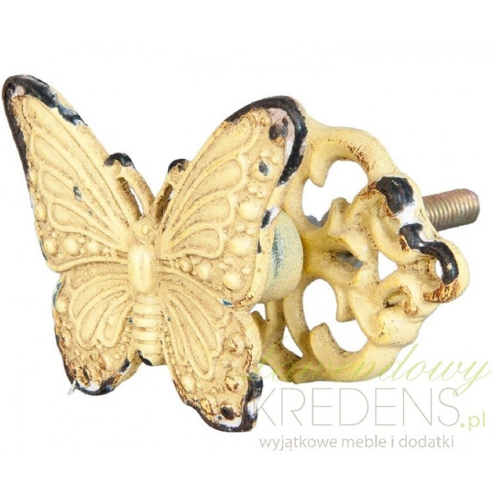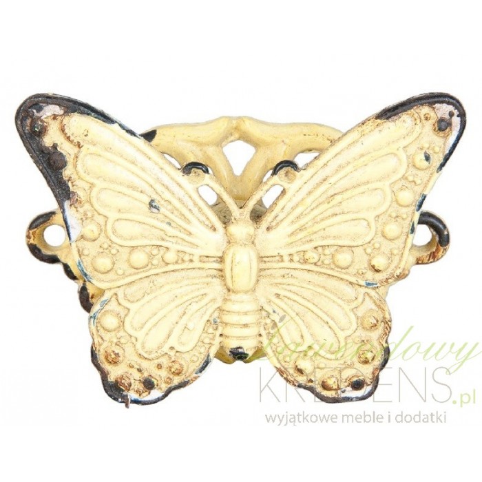 Gałki do mebli mają unikalny kształt motyla, dzięki czemu wszystkie dziewczynki będą mogły podziwiać swoje meble. Gałki meblowe mają kremowy, mocno przetarty miejscami kolor i wykonane są z metalu. Uchwyty do mebli wyglądają na nieco zniszczone, co dodaje im niezwykłego uroku.