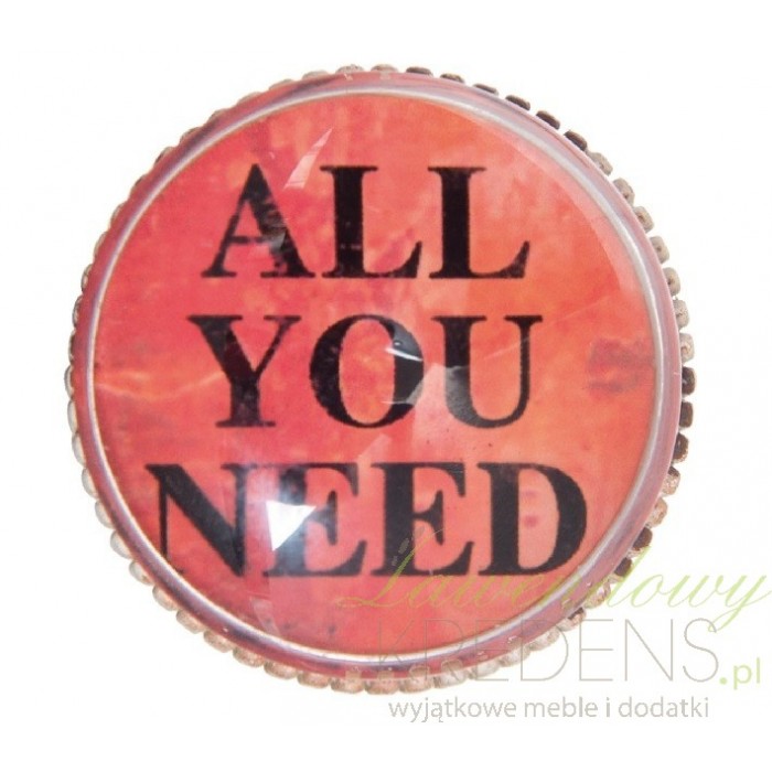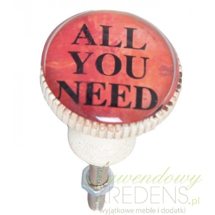 Uchwyty do mebli w niepowtarzalny sposób mogą odmienić wnętrze twojego mieszkania. Gałki meblowe mają czerwony kolor i okrągły kształt. Gałki do mebli firmy Clayre & Eef mają duży, czarny i angielski napis ALL YOU NEED. To niezwykle oryginalna dekoracja twojego pokoju.