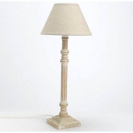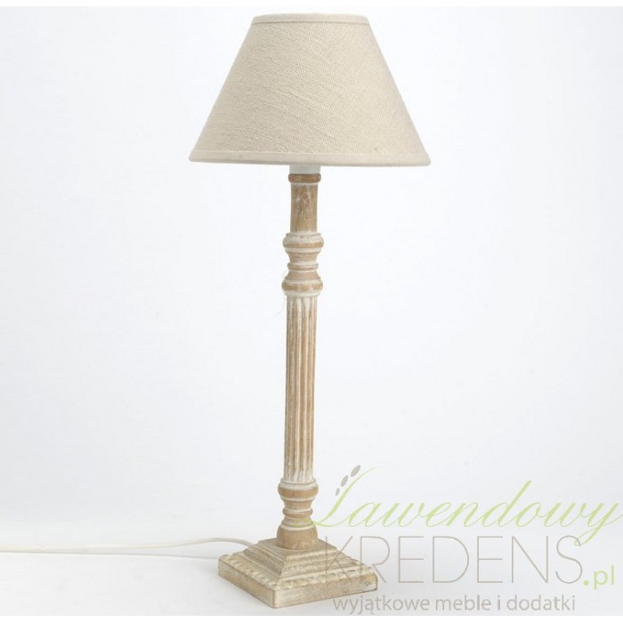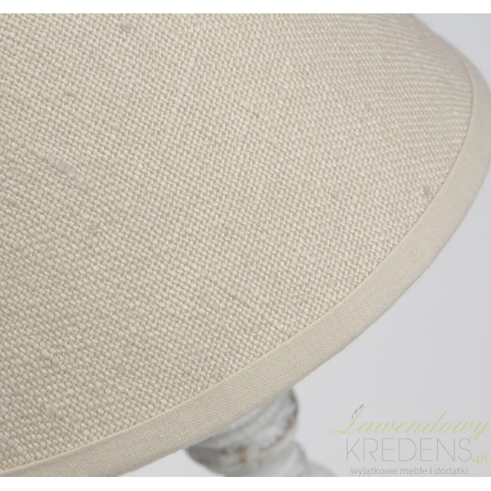 Lampa w stylu prowansalskim posiada beżowy abażur i ślicznie rzeźbioną bieloną nogę. Lampa prowansalska pochodzenia francuskiego ma prawie pół metra wysokości i umieszczona jest na