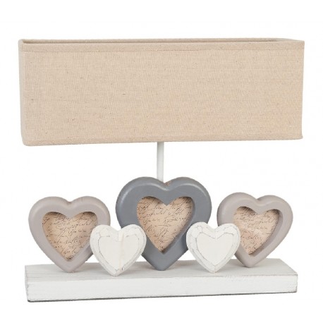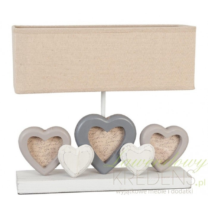 Lampa prowansalska jest ustawiona na prostokątnej podstawie, na której również stoją trzy ramki i serca. Ramki w kolorze szarym i jasnobrązowym stanowią świetne połączenie z beżowym abażurem. Lampka nocna ma podłużny i prostokątny abażur. Dokonaj odpowiedniego wyboru oświetlenia wnętrza i postaw na wyjątkowe lampy w stylu prowansalskim od Clayre&Eef.