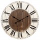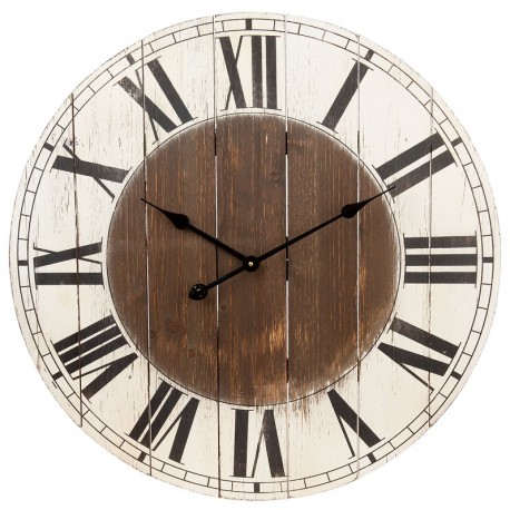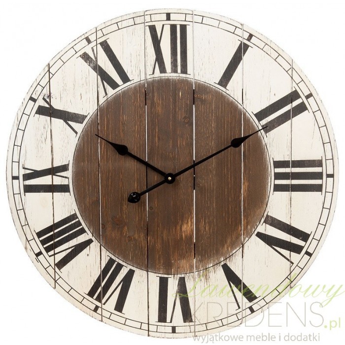 Duży zegar prowansalski swoją średnicą wymiecie ze ściany wszystkie inne dekoracje i zaprowadzi klimatyczny nastrój w całym wnętrzu. Zegar drewniany pomalowano na kremowy i brązowy kolor. Zewnętrzny pierścień w jasnym kolorze prezentuje duże, rzymskie cyfry, w środku brązowego kółka w centrum zegara zamocowane są dwie czarne wskazówki. Duże zegary ścienne polecamy zawiesić w miejscach takich jak pusta ściana w salonie lub w wolnym miejscu nad murowanym kominkiem.
