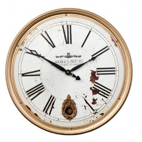 Zegar vintage oprawiony został w urokliwą ramkę w odcieniu koloru złota. Biała tarcza z widocznymi postarzeniami i napisami przypomina zegar wydobyty z zapomnianego pałacu. Proste, dwie czarne wskazówki i cyfry w tym samym kolorze pozwolą odczytać godzinę bez konieczności wpatrywania się w zegary ścienne. Wybierz zegary w stylu vintage takie jak piękny zegar z napisem Hotel do ozdoby współczesnego wnętrza i nadaj mu tym samym antycznego posmaku.