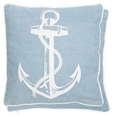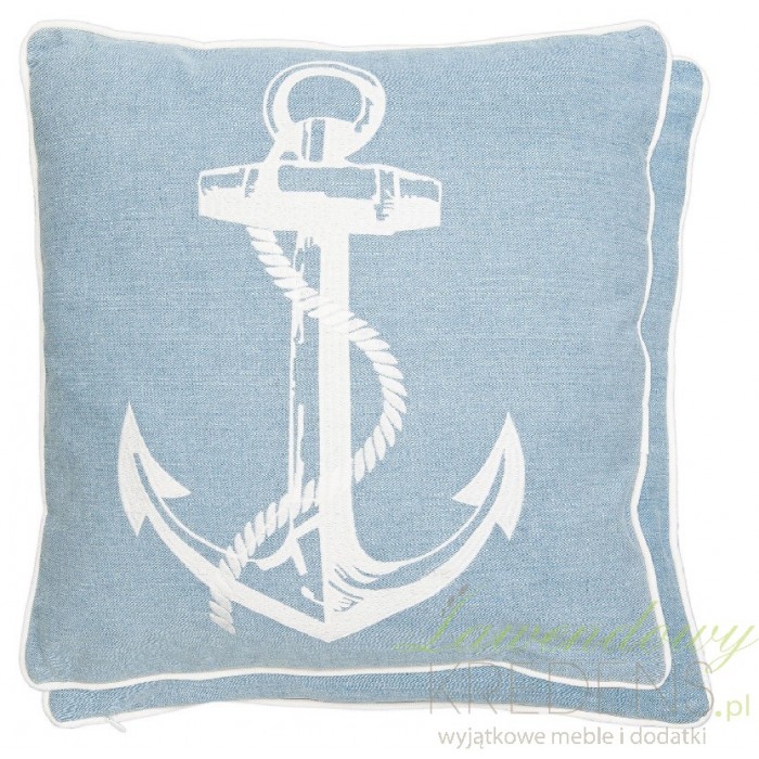 Niebieska poduszka narynistyczna z białą kotwicą, to dodatek jakiego będziesz potrzebował do urządzenia wnętrza na styl marynistyczny.