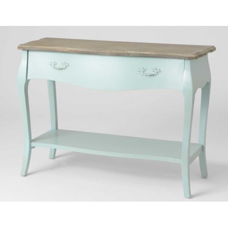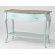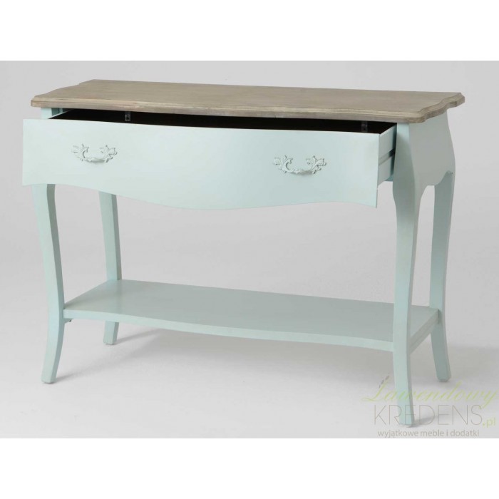 Rewelacyjna konsola prowansalska z bardzo modnym, miętowym kolorze, podkreślonym bielonym blatem w kolorze naturalnego drewna. Takie zestawienie daje bardzo naturalnie wyglądające połączenie, które ożywi wnętrze i sprawi, że Twoje otoczenie będzie niezapomniane. Duży plus za pojemną szufladę!