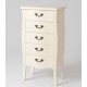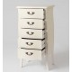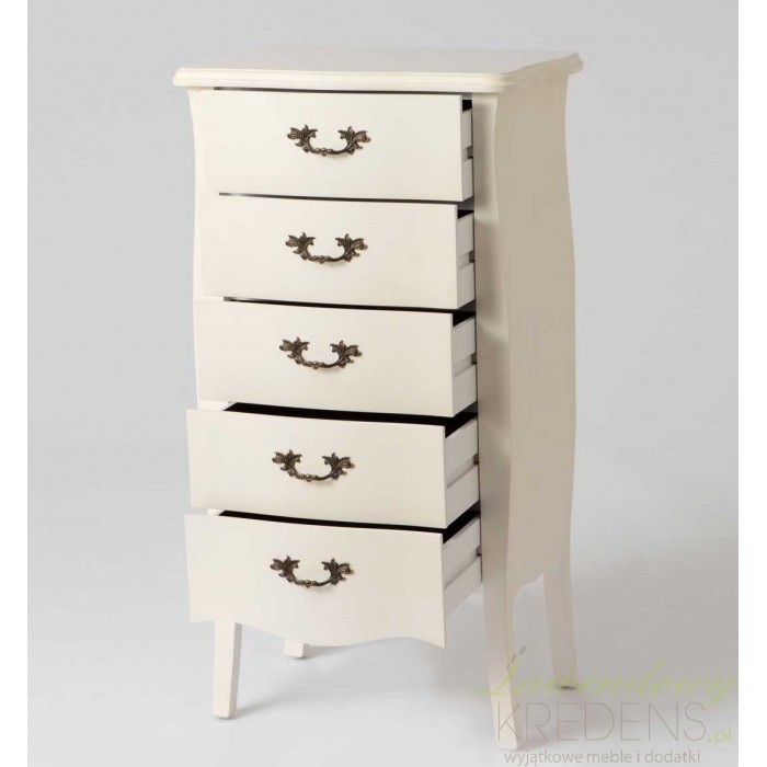 Wąskie komody w stylu prowansalskim z kolekcji Diana to klasyczne komody z wieloma szufladami w pionowym ułożeniu, idealne na elementy tekstyliów stołowych, kosmetyków czy bielizny. Ich przeznaczenie ogranicza tylko Twoja wyobraźnia. Zwróć uwagę na ozdobne fronty szuflad z metalowymi uchwytami o motywie roślinnym.