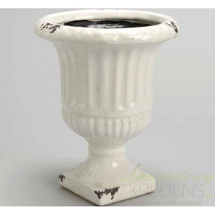 Puchar na kwiaty ma śliczny biały kolor i liczne przetarcia farby. Jest niezwykle uroczy i stoi na kwadratowej podstawie. Posiada delikatne pionowe pasy. Dodatki w stylu prowansalskim i puchary na kwiaty to cudowna dekoracja twojego domu.