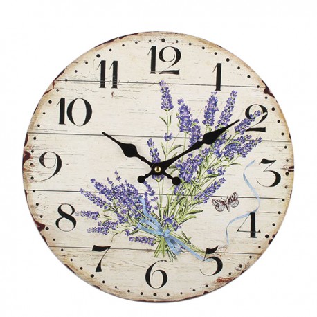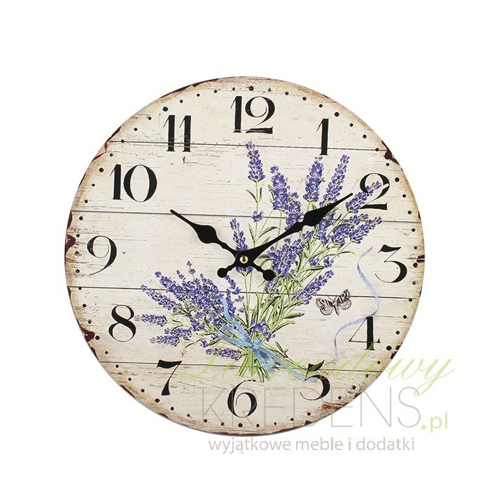 Prowansalski zegar z lawendą o średnicy trzydziestu czterech centymetrów. Okrągłą tarcza zegara jest ozdobiona gałązkami lawendy przewiązanymi błękitną wstążką. Po prawej stronie od lawendy widnieje latający motylek. Grafika ta znajduje się na tle imitującym drewaniene deski ułożone w poziomie. Zegary ścienne z lawendą będą świetnie wyglądały na ścianach o każdej barwie.