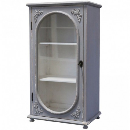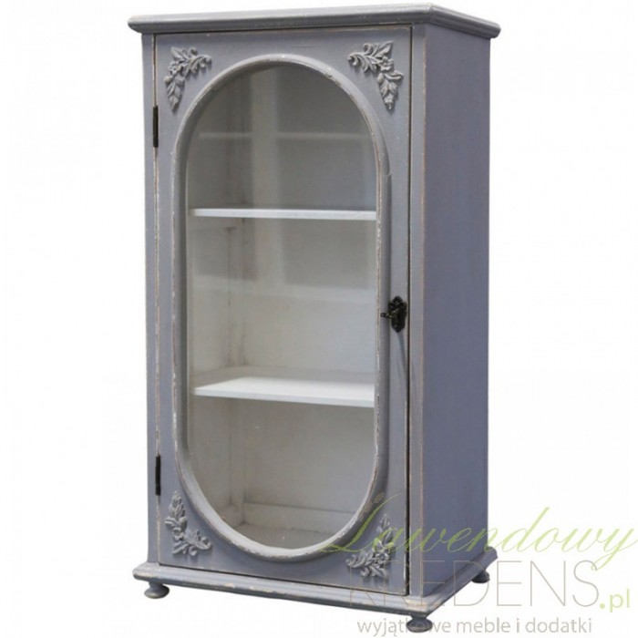 Pionowej konstrukcji szara komoda w stylu prowansalskim z białym wnętrzem, które pięknie podkreśla elegancki kolor na zewnątrz. Owalne przeszklenie z wypukłymi ozdobami na rogach drzwiczek, sprawi, że środek komody będzie widoczny, a jednocześnie całośc prezentuje się nienagannie i elegancko.