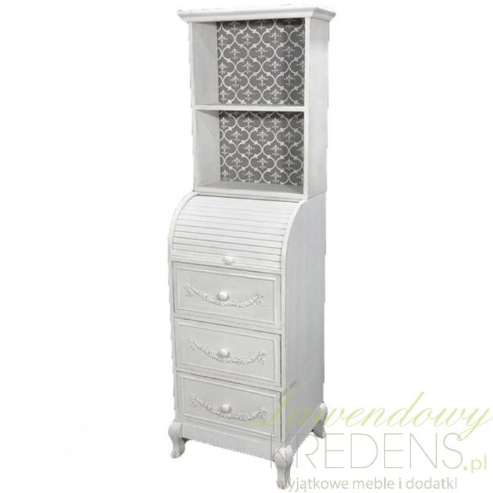 Dekoracyjny regał prowansalski, z wbudowanymi trzema szufladami, dwiema otwartymi półkami i półką zakrytą półkolistą zasuwą, podobną do tych stosowanych w sekretarzykach. Antyczna biel powierzchni zostałą przełamana grafitowym tłem półek!