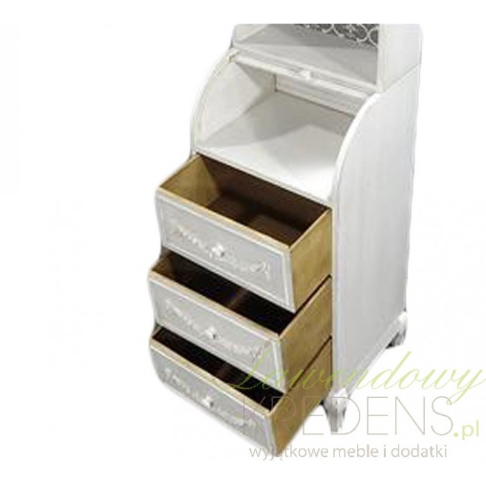 Niecodziennej budowy regał prowansalski w kolorze antycznej bieli, który skrywa w sobie różne rodzaje półek i szuflad!