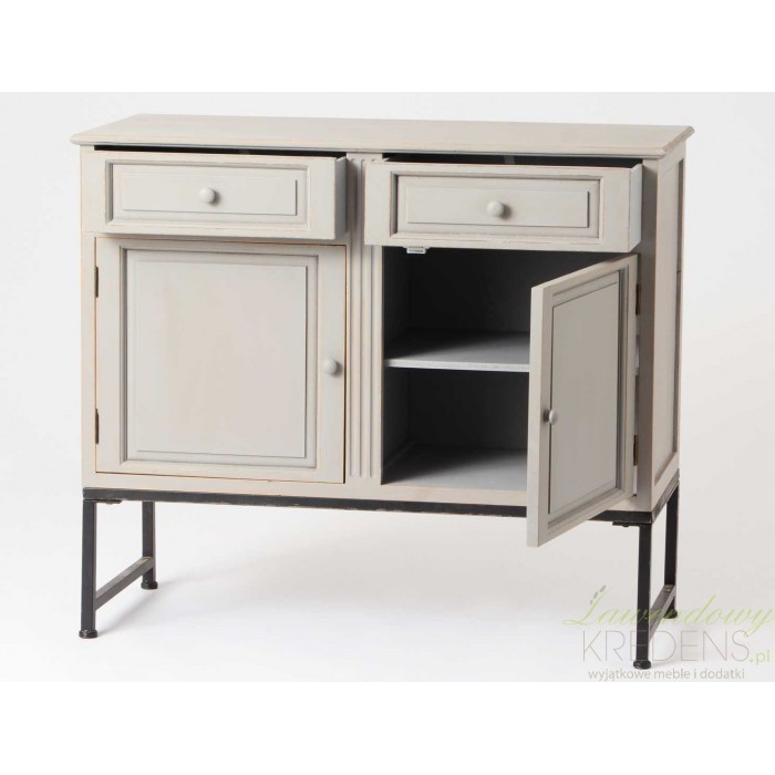 Meble postarzane to w obecnych czasach niezwykle modne i popularne rozwiązanie w wystroju wnętrza. Komoda postarzana pochodzenia francuskiego wykonana jest z wysokiej klasy drewna, metalu i płyty MDF. Ma szary kolor i stoi na wysokich, prostych nogach. Szara komoda ma dwie szufladki na bieliznę lub sztućce oraz dwie większe szafeczki z półeczkami.