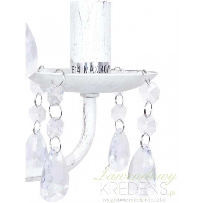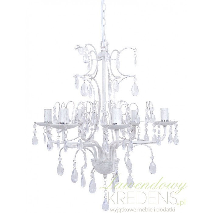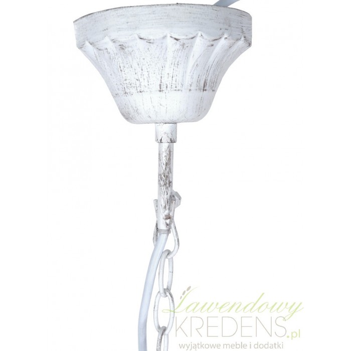 Biały żyrandol prowansalski ma sześć dekoracyjnych ramion zakończonych gwintami. Każde z metalowych ramion i środek zyrandola to metalowe uformowania. Zwróć uwagę na kryształy, które przymocowane do ramion i do trzonu zyrandola efektownie rozpraszają światło płynące z żarówek. Żyrandole w stylu prowansalskim takie jak żyrandol z kryształkami w jasnych kolorach z delikatnymi postarzeniami nadają się doskonale do wnętrz o królewskich standardach.