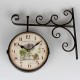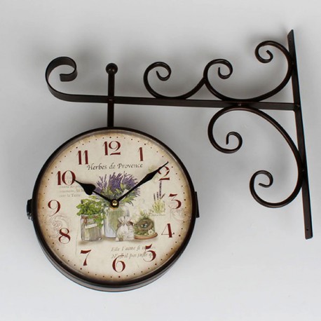 Metalowy zegar dwustronny w kremowej obudowie i wieszakiem z lilijką, którego obecność pozwala na funkcjonalne wykorzystanie dwóch tarcz. Na każdej tarczy widzimy cyfry arabskie w dużym formacie, które wraz ze wskazówkami są dobrze widoczne nawet z daleka. Centalnym punktem tarcz jest wazonk z bukietem pięknej lawendy!