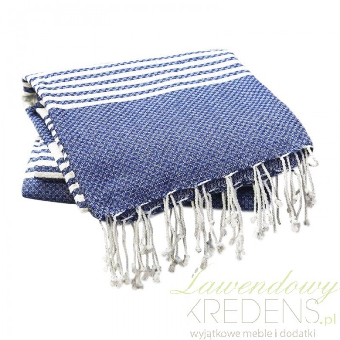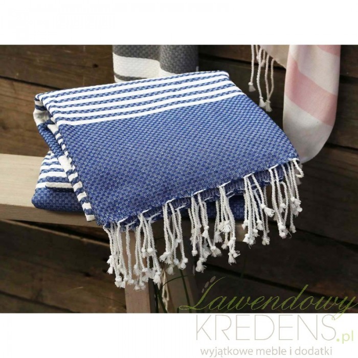 Idealny na letnie podbije plażowe, niebieski ręcznik kąpielowy od Chic Antique z dekoracyjnymi frędzlami na krótszych krawędziach!