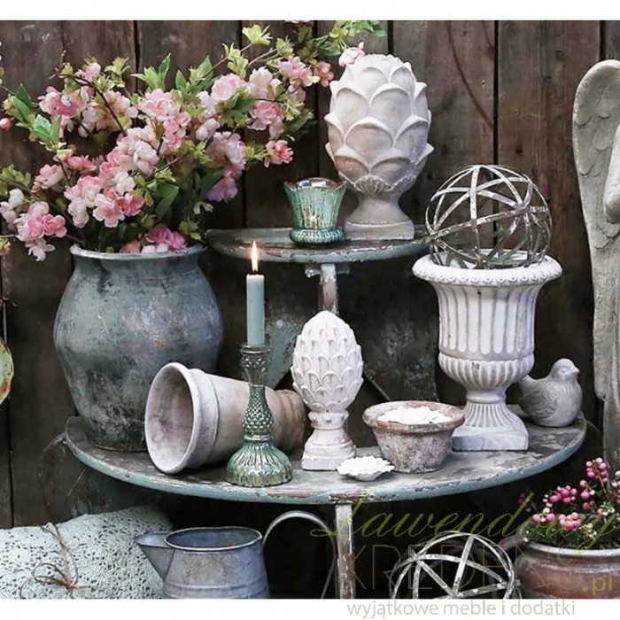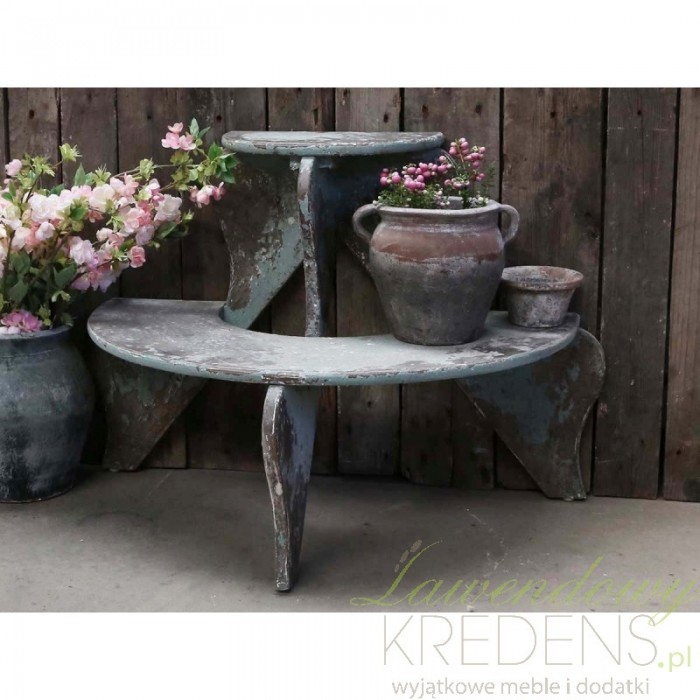 Dwupiętrowy kwietnik w stylu prowansalskim, w wyglądu przypominający półokrągły stolik z nadbudową. Przepięknie postarzany!