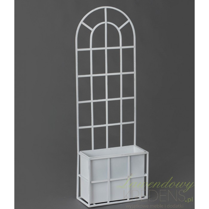 Biały kwietnik prowansalski z przeznaczoną do ozdoby i dla roślin pnących podporą kratowaną. Z daleko przypomina ozdobną okiennicę!