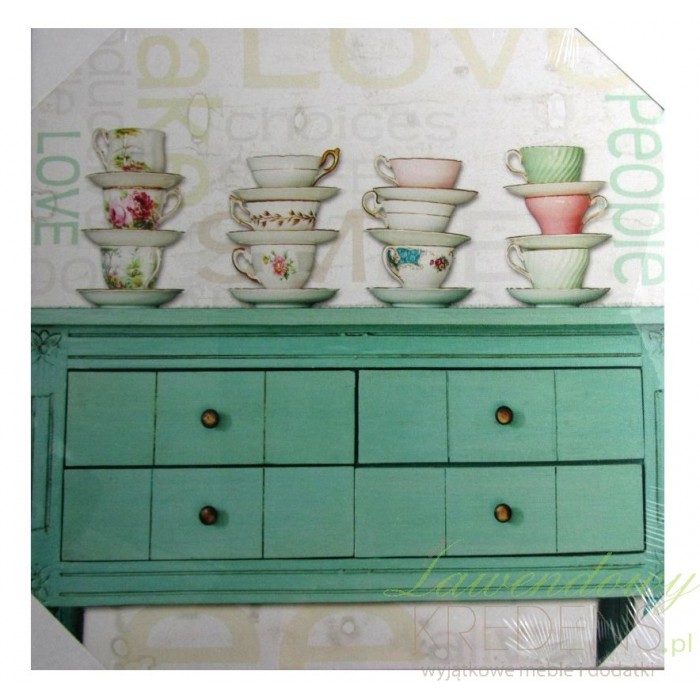Odpowiedni obraz na ścianie w kuchni lub w jadalni uprzyjemni wspólne spotkania przy posiłku lub kawie. Duży obraz prowansalski przedstawia półkę w miętowym kolorze i kolorowe filiżanki. Obrazy w stylu prowansalskim rozpoznasz po pastelowych i ciepłych barwach. Prowansalskie dekoracje to najlepszy wybór do ozdoby ściany!