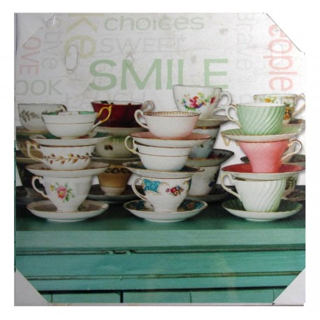 Kolorowy obraz prowansalski przedstawiający stos filigranowych filiżanek ze spodkami oraz z różnymi napisami w języku angielskim. Obrazy w stylu prowansalskim to ciekawe dodatki, które ozdobią Twoje wnętrze. Prowansalskie dekoracje w piękny sposób oddadzą klimat tego stylu. Obrazy można powiesić w wielu miejscach, np. świetnie nadadzą się do kuchni lub do restauracji czy kawiarni.