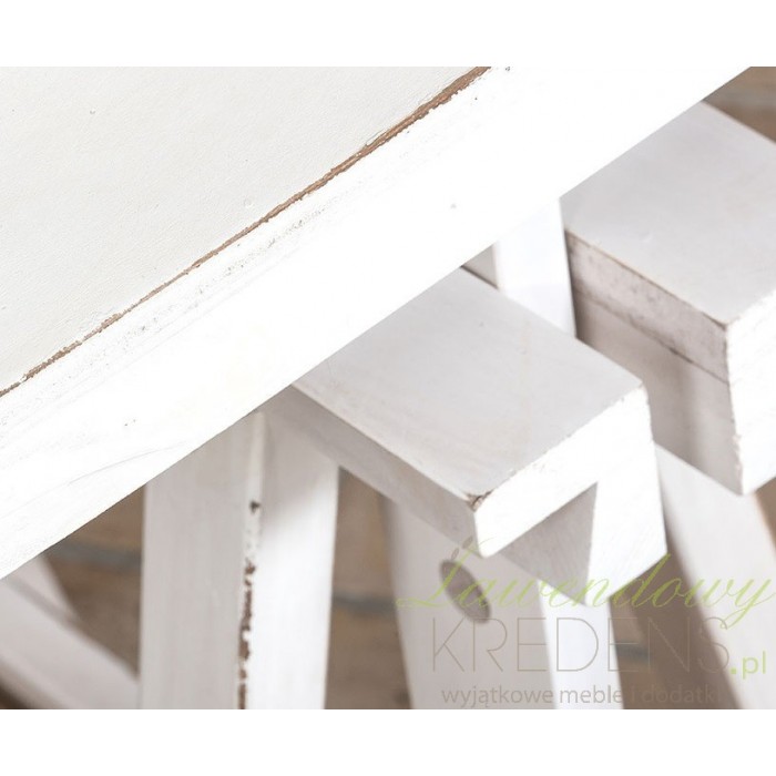 W całości drewniany, biały stolik o nietypowych nogach, które mogą służyć także za podręczne półki. Dodatkowo istnieje możliwość regulacji wysokości!