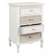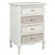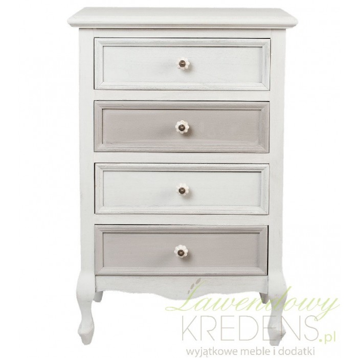 Zgrabna komoda w stylu prowansalskim z szufladami w dwóch kolorach, które mają przykręcone gałki w kształcie kwiatuszków.