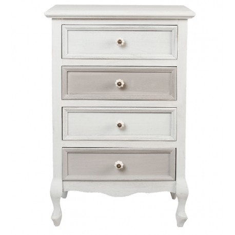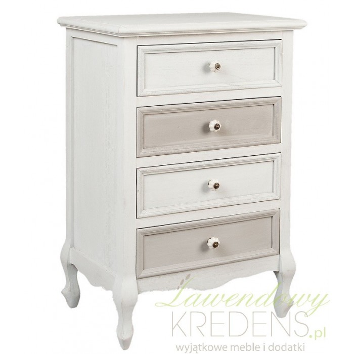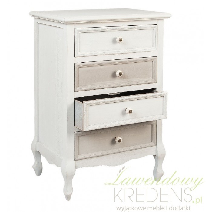 Jasnoszara komoda prowansalska od Clayre&Eef ma 80cm wysokości. Mebel ma prosty kształ, a zaokrąglone zostały jedynie jego nogi i cokół pod szufladami. Wewnątrz komoda w stylu prowansalskim skrywa cztery pojemne szufladki. Dwie z nich mają nieco ciemniejszy odcień szarości. Wybierając meble prowansalskie możesz urządzić ponadczasowe wnętrze salonu lub sypialnię.